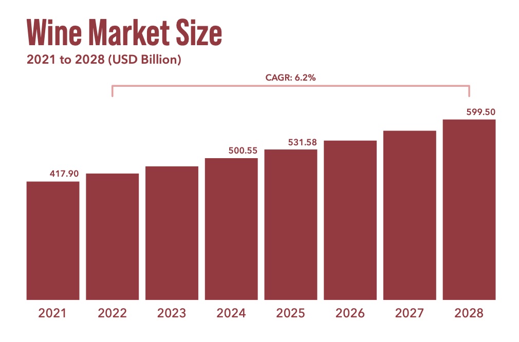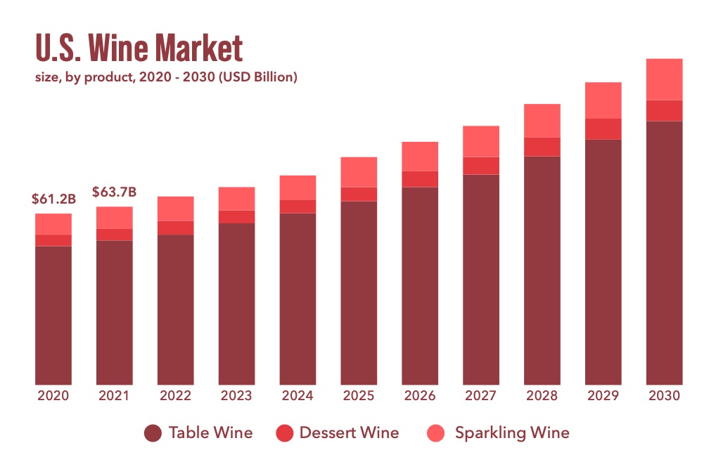 The above graph demonstrates the overall growth in the United States wine market and projected future growth through 2030, as per Grandview Research.